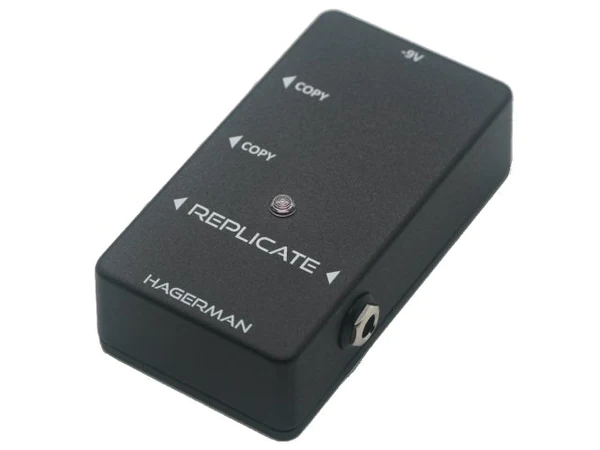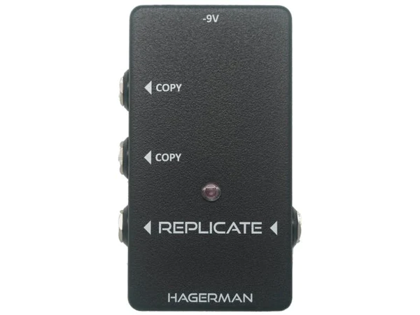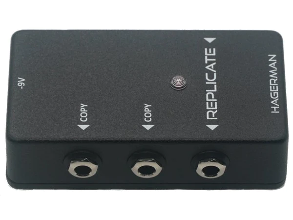 The REPLICATE pedal is designed to drive two or three amplifiers from a single guitar or pedal chain. The main output is a direct connection to input, thereby providing load seen by guitar. Copied outputs are independently isolated from ground in order to prevent ground loops, which typically end up injecting hum or buzz into the signal path. Bandwidth is exceptional, operating all the way down to 10Hz, making the pedal useful for bass and synthesizer as well. Output impedance is superbly low, capable of driving long lines without treble loss.